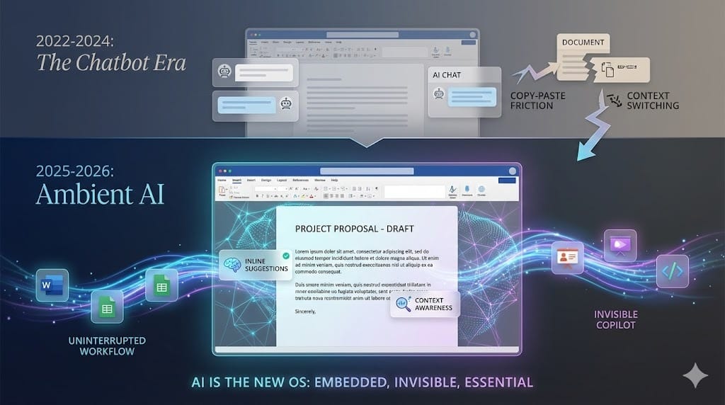 Avant (2022-2024) : Vous voulez améliorer un texte. Vous ouvrez ChatGPT dans un nouvel onglet, vous copiez-collez votre paragraphe, vous attendez la réponse, vous évaluez le résultat, vous le recopiez dans votre document Word. L'IA était une étape séparée de votre workflow, un détour conscient dans votre processus de travail.